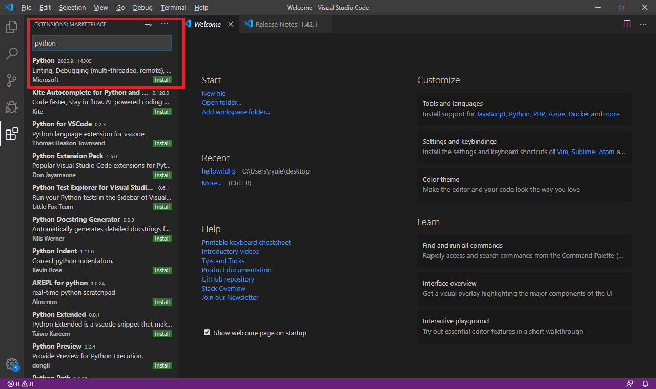 VSCode가 설치되면, 맨 왼쪽에 5개의 아이콘을 확인하실 수 있습니다. 그 아이콘 중 맨 아래의 아이콘이 Extenstions 아이콘입니다. 검색 창에서 Python을 입력하면, 가장 인기가 많은 Extension:Python을 확인할 수 있으며, 이를 선택 설치하면, VSCode에서 파이썬을 이용할 수 있는 준비가 완료됩니다 .