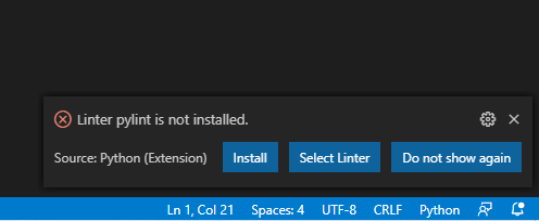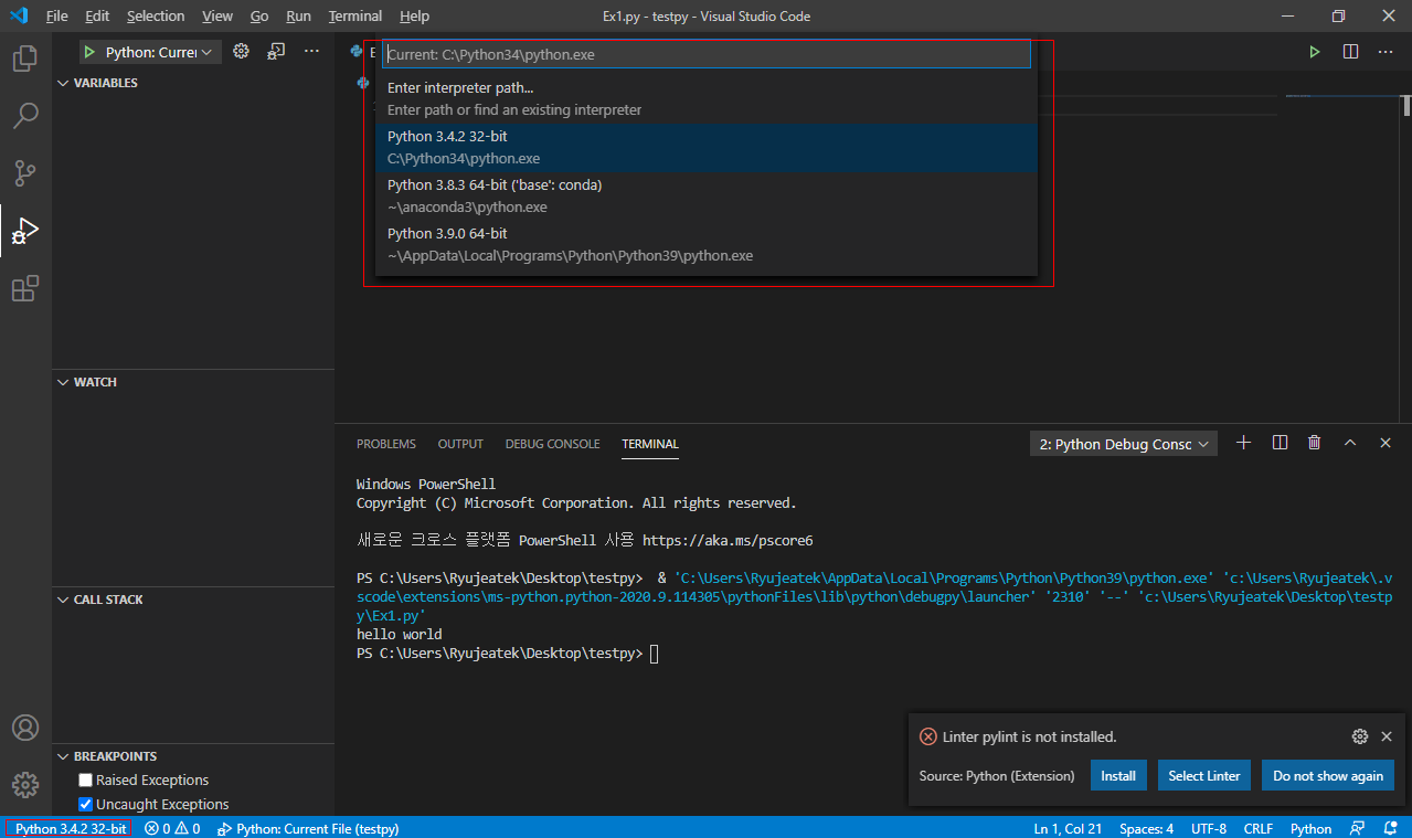만약 이 과정에서 pylint를 설치하라는 오류 창이 발생하는 경우가 있습니다. 이 경우 설치가 정상이면 문제가 없지만, 만약 그렇지 않으면 파이썬 버전이 문제로 최신 Python을 설치해 주어야 합니다. 주의해야할 점은 설치 후 VSCode에서 파이썬 버전을 변경 후 실행해 주어야 합니다.