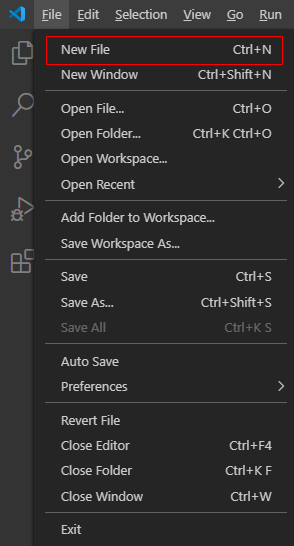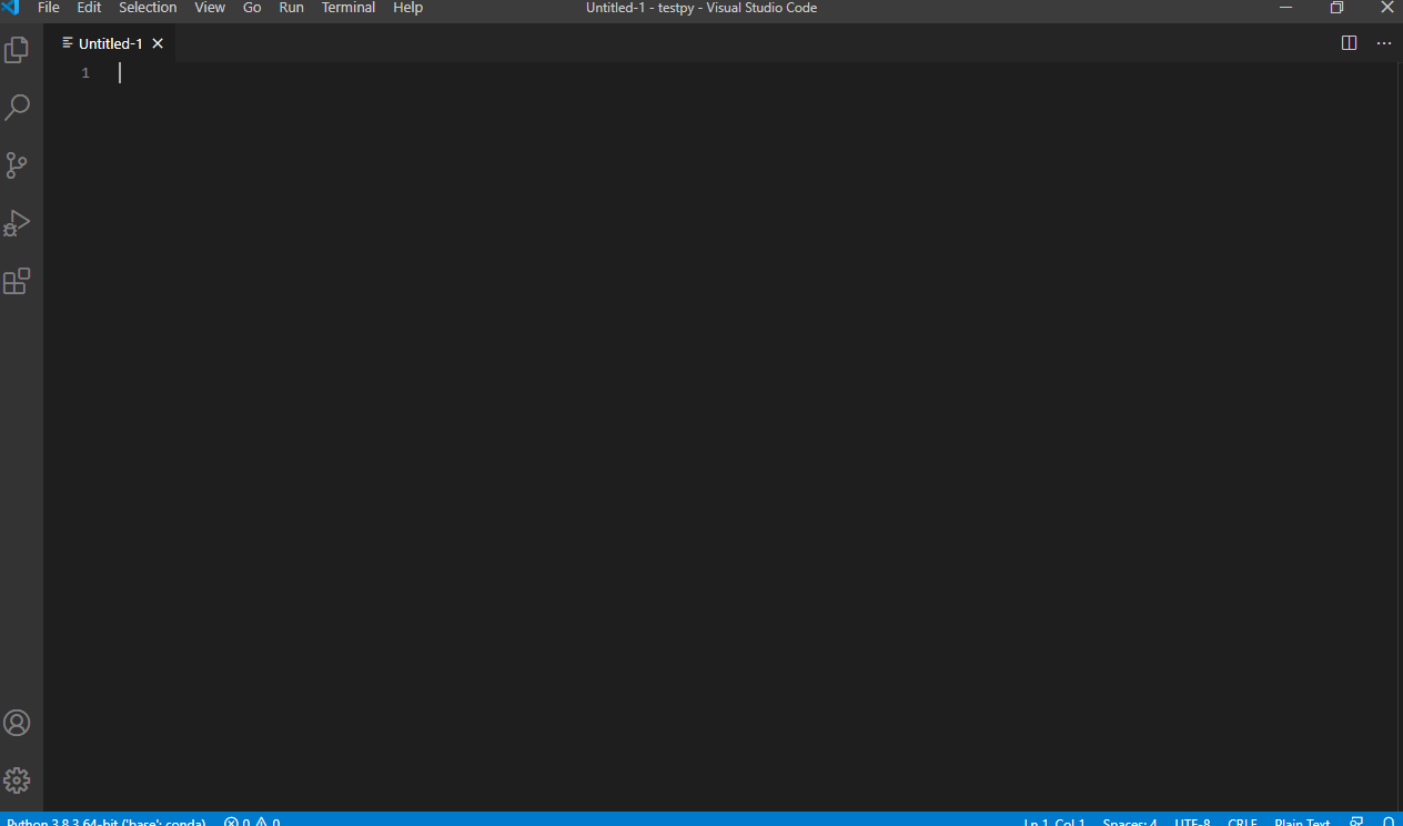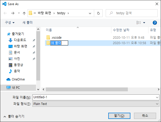 우선 향후 찾고 정리하기 편하게 VSCode를 통해 파이썬 소스코드를 저장할 폴더를 만듭니다. 그리고 New File 메뉴를 선택, 코드를 작성할 탭을 생성합니다. 이 때 탭은 Untitle이라는 명칭을 가지며, 아직 저장이 되지 않은 상태입니다.