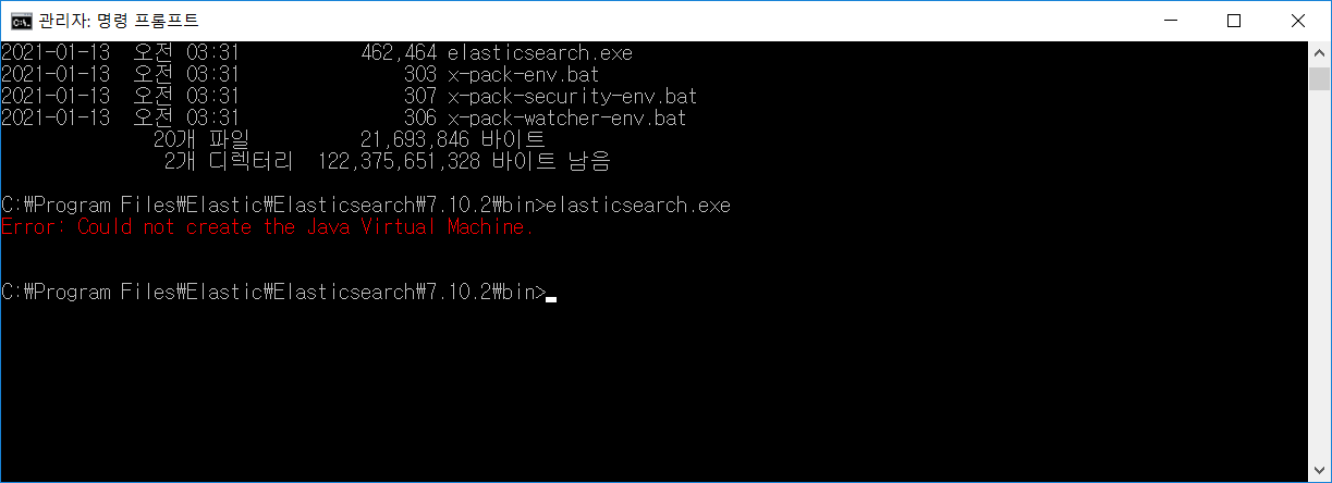 위의 설정을 변경하지 않을 경우 Elasticsearch.exe에 다음과 같은 애러가 발생하게 됩니다. 이 부분을 수정하는게 생각보다 많이 시간이 걸릴 수 있으므로 관련사항을 잘 처리하시고, 혹여 관련해 수정이 안될 경우 덧글을 통해 문의 부탁드립니다.