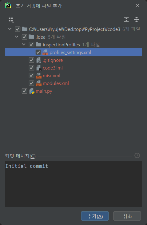 여기서 저장소 이름은 보통 프로젝트 이름으로 설정되게 되며, 이 이름이 Github의 Repository 명칭으로 설정이 됩니다. 마직막으로 공유버튼을 클릭합니다. 아래와 같이 초기 커밋에 파일추가 화면이 나타나게 되며, 추가를 선택합니다.