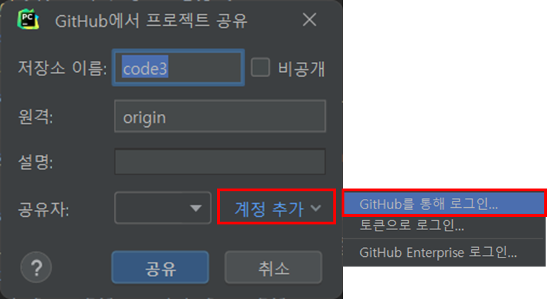 선택메뉴에서 저장소 이름, 원격 설명, 공유자를 설정합니다. 먼저 공유자에 대한 설정을 하겠습니다. 계정추가를 선택해 Github를 통해 로그인을 선택합니다.