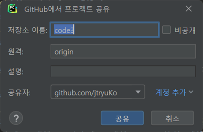 해당 메뉴를 선택하면 아래와 같이 Github에 프로젝트 공유 메뉴가 나타납니다.