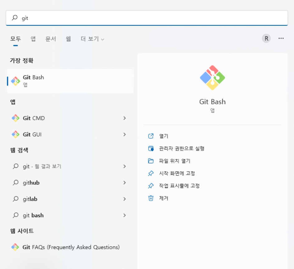 Git으로 작성된 내용을 Github에 업로드 시키기 위해서는 Git bash를 통해서 Git에 몇가지 설정을 해야합니다. Git Bash는 Git을 설치하였다면 윈도우에서 Git Bash를 검색해 실행할 수 있습니다. Git bash를 실행하면 아래 왼쪽 그림과 같이 Bash가 실행됩니다.