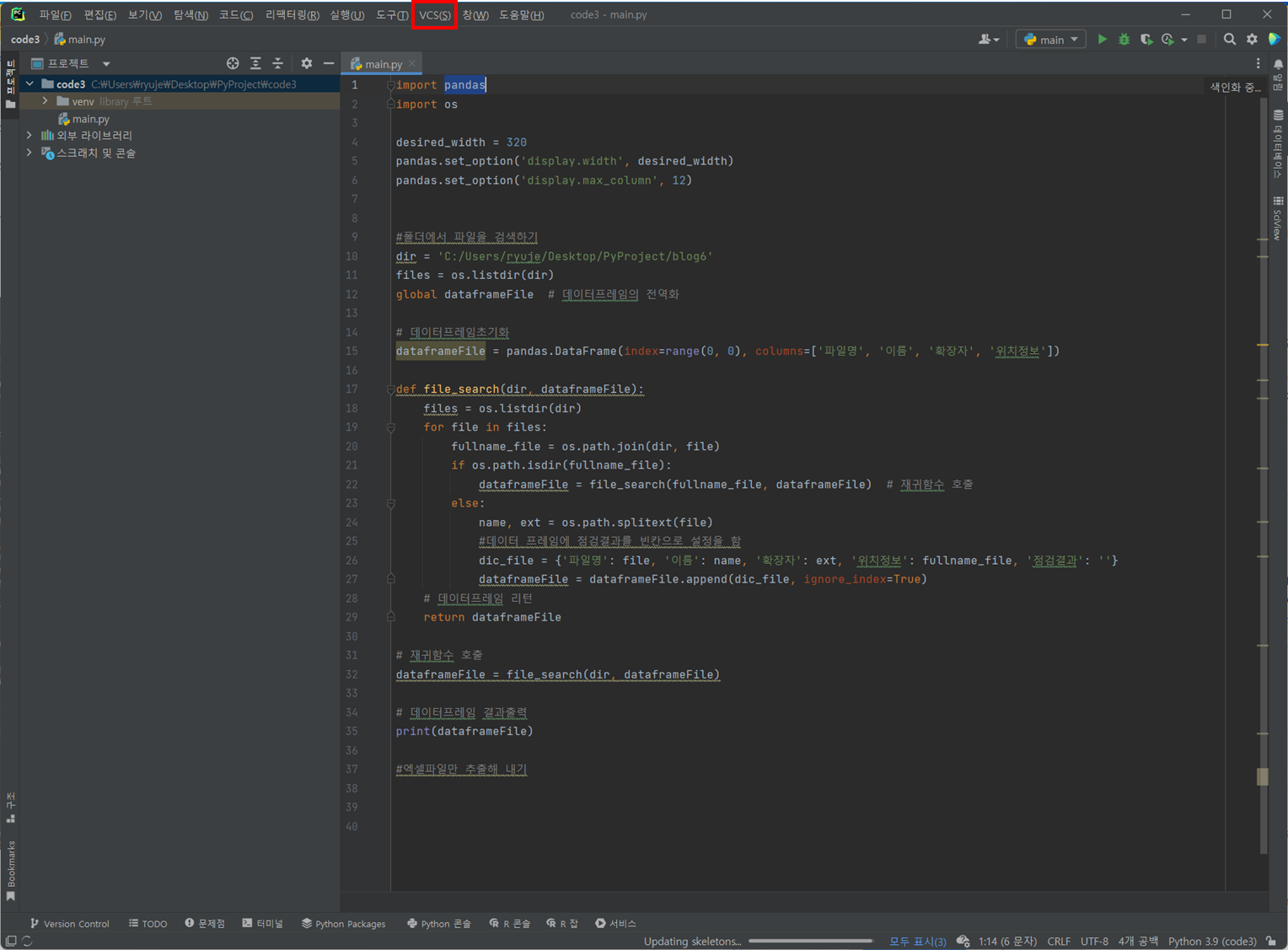 그럼 이제 PyCharm을 통해서 소스코드를 Github에 올려보도록하겠습니다. 아래 그림에서 메뉴에서 VCS를 선택합니다.