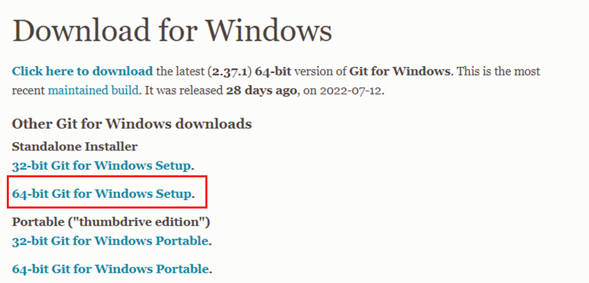 Git 사이트를 통해 Git을 다운로드 받아 설치를 합니다. 붉은색으로 표시된 링크를 클릭합니다.