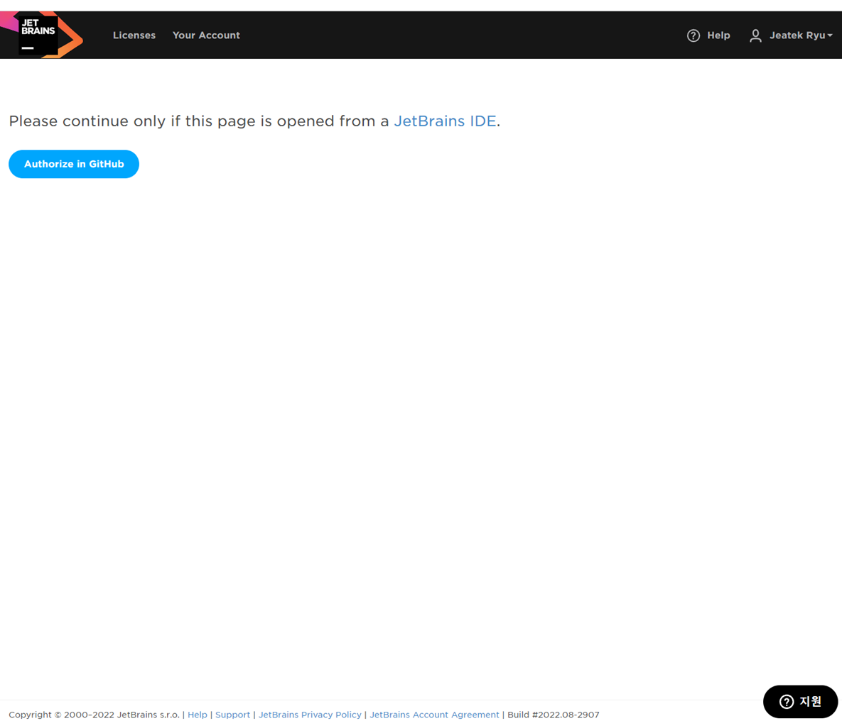 선택을 하면 아래와 같이 링크로 Jetbrain 화명으로 이동합니다. 여기서 Authhorize In Github를 선택합니다. 그 다음화면에서 Authorize Jetbrains를 선택합니다.