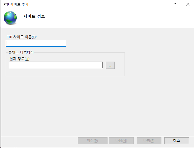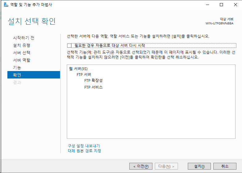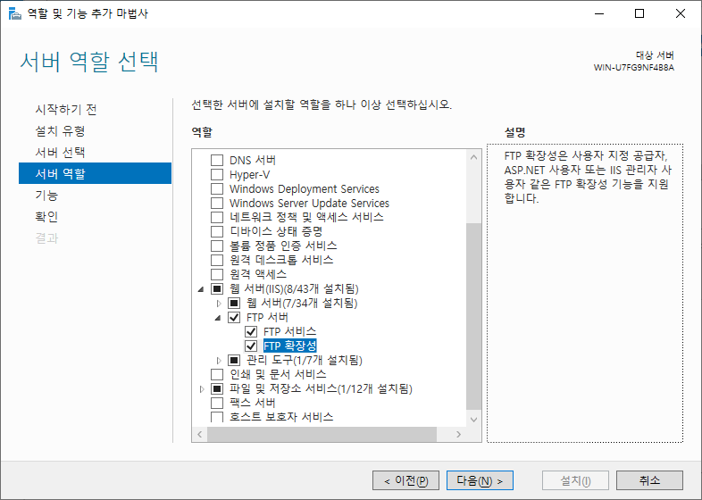 위와 같이 서버관리자 > 역할 및 기능 > 웹 서버 > FTP 서버에서 FTP 서비스, FTP 확장성 둘 모두 설정에 체크를 합니다.