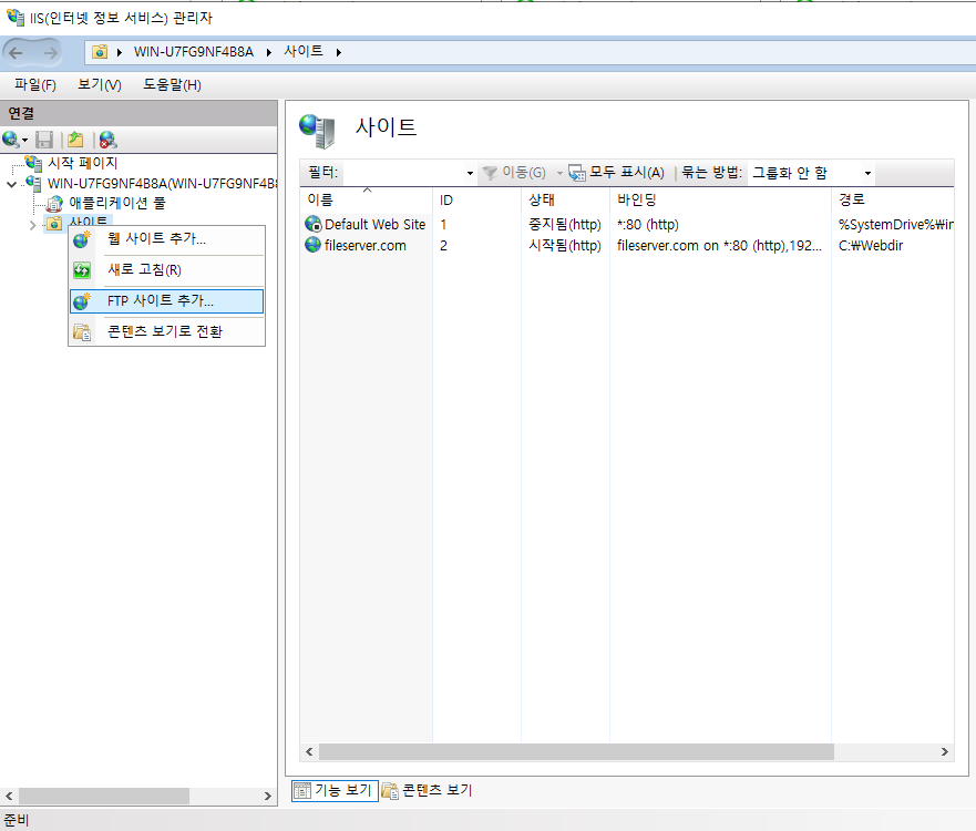 IIS(인터넷 정보 서비스) 관리자에서 [FTP 사이트 추가]를 선택합니다.