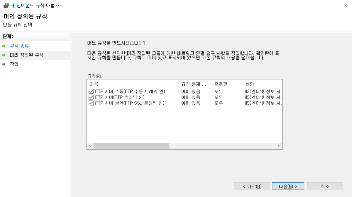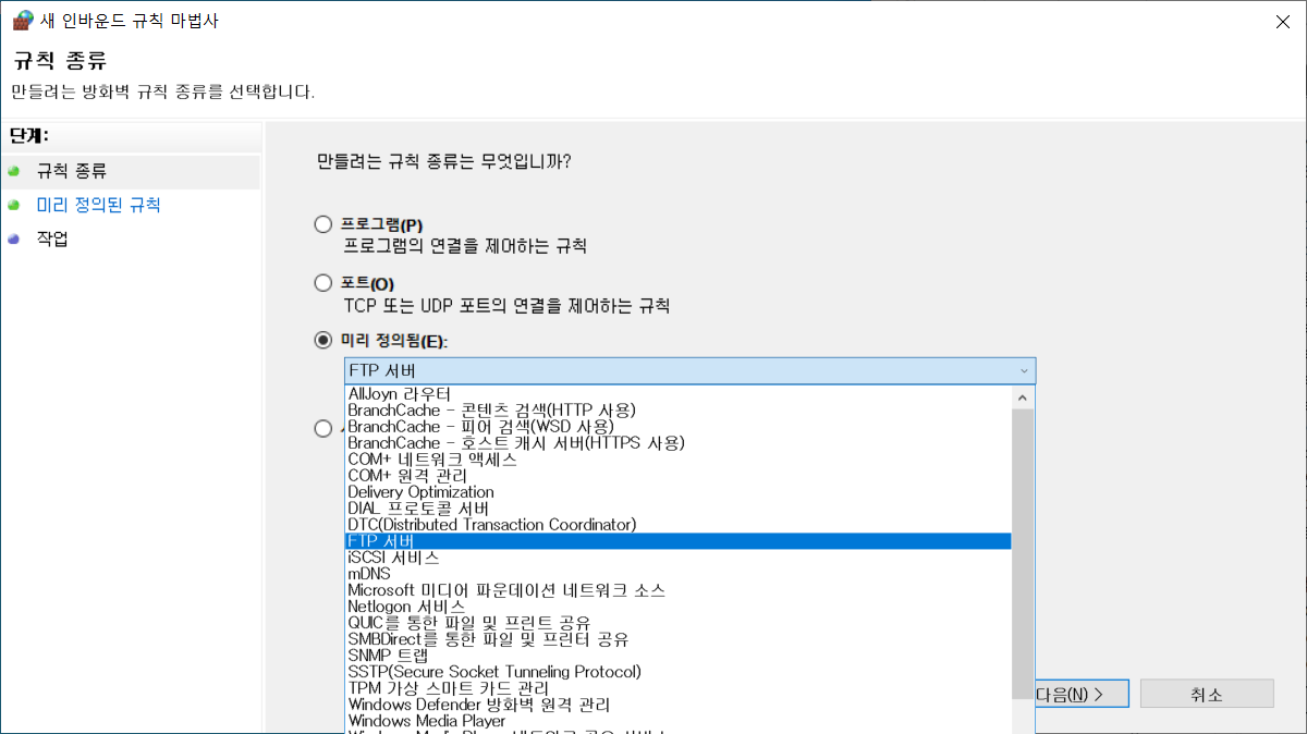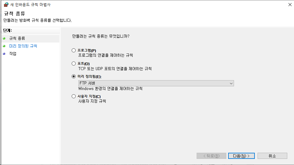 이제 방화벽 허용을 해주겠습니다. 인바운드 규칙을 생성하겠습니다. 새 인바운드 규칙 마법사에서 미리 정의됨을 선택하고, FTP 서버를 선택합니다.