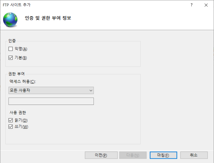 이후 인증은 기본, 권한 부여에서는 엑세스 허용 모든 사용자, 사용권한 읽기, 쓰기를 모두 체크합니다.