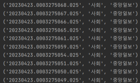 cursorDB = conn.execute(Query_String, {"publisher" : "중앙일보", "category" : "사회"})